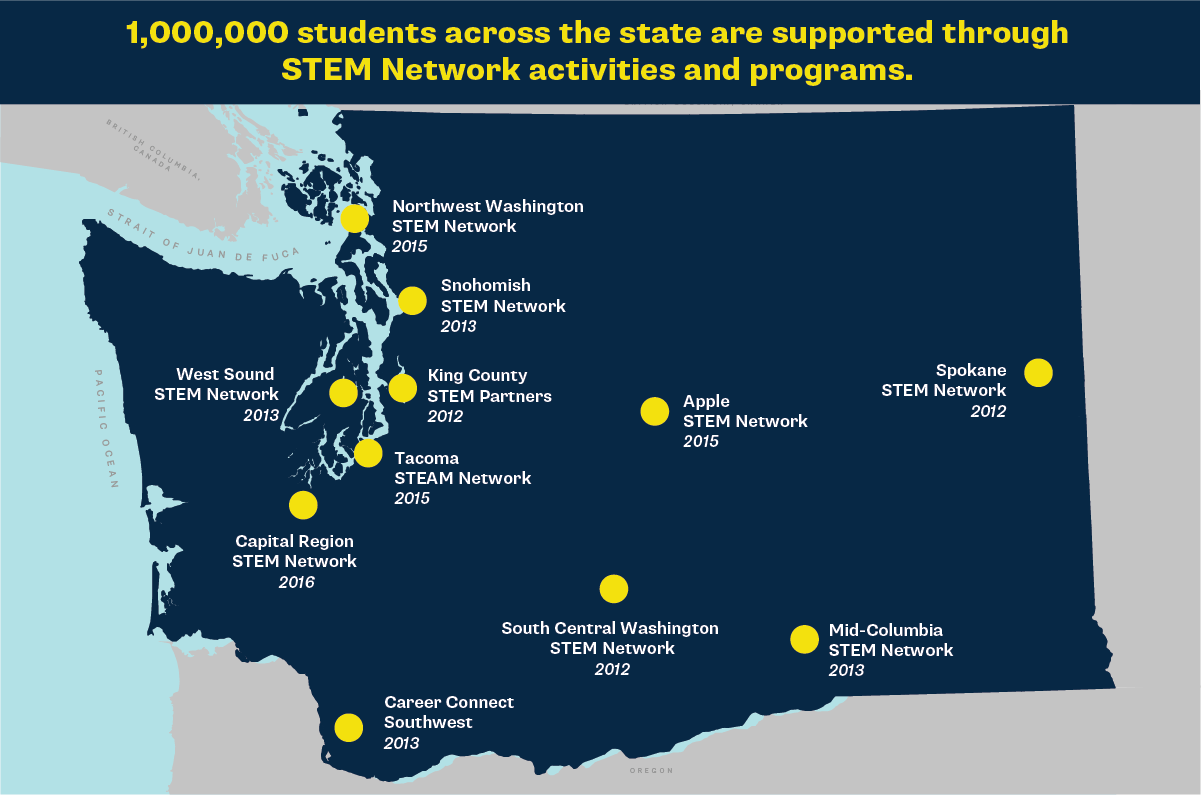 Washington STEM partners with 10 regional Networks to develop programs and goals specific to local communities. Learn more about the impact of our STEM Networks, partnerships, and initiatives in these regional reports: