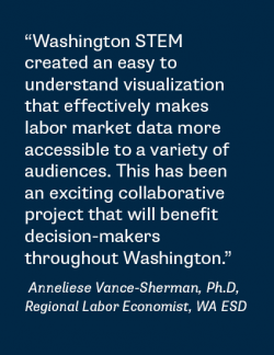 “Our mission at ESD is to provide our communities with inclusive workforce solutions that promote economic resilience and prosperity. One of the ways we work to accomplish this mission is by publishing labor market information that is free and available to all Washingtonians. Washington STEM created an easy to understand visualization that effectively makes labor market data more accessible to a variety of audiences. This has been an exciting collaborative project that will benefit decision-makers throughout Washington.”  says Anneliese Vance-Sherman, Ph.D., Regional Labor Economist with WA ESD.