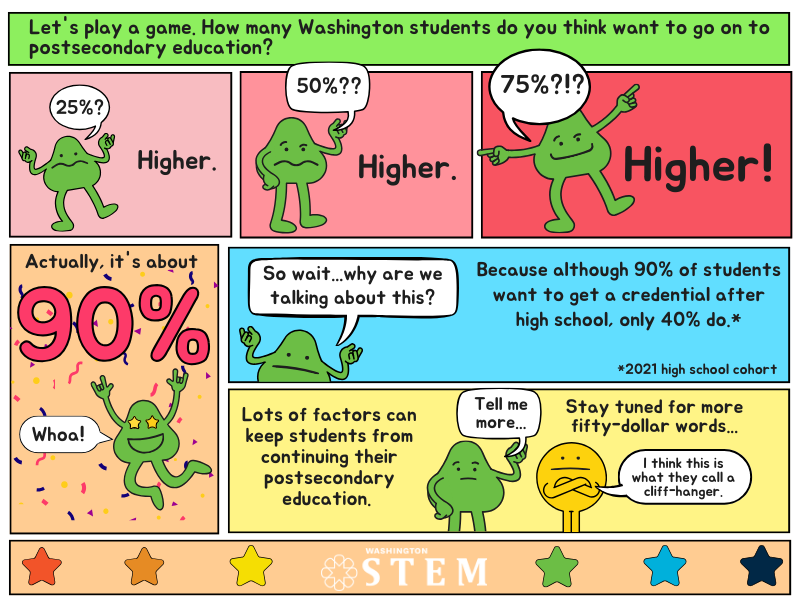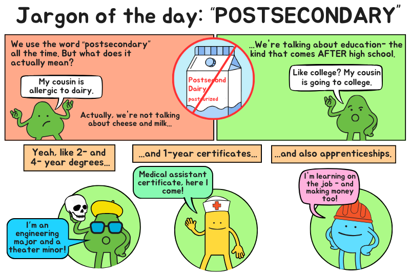 There is a lot of jargon in education advocacy. Here at Washington STEM, we are guilty of using a few five-syllable, fifty-dollar words ourselves. That's why we created De-Jargon-ize It, a new comic series that will help us all get on the same page, understand statewide education issues, and win Scrabble. In this first installment, we unpack the term "postsecondary."