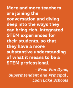 “More and more teachers are joining the conversation and diving deep into the ways they can bring rich, integrated STEM experiences for their students, so that they have a more substantive understanding of what it means to be a STEM professional,” said Brad Van Dyne, Superintendent and Principal of Loon Lake Schools.