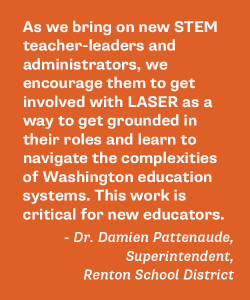 “As we bring on new STEM teacher-leaders and administrators, we encourage them to get involved with LASER as a way to get grounded in their roles and learn to navigate the complexities of Washington education systems. This work is critical for new educators,” Dr. Damien Pattenaude, Superintendent, Renton School District.