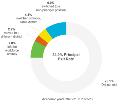 A policy brief published by researchers at the University of Washington College of Education found that in 2023, principal turnover reached 24.9%—up from 20% pre-pandemic levels. Lead researcher, associate professor David Knight, said although principals left their posts across many different contexts—urban, rural and suburban—not all departures represented fewer educators in the system. Data on principal turnover from 2022 show that 9.9% left principal positions for other jobs in the K-12 system while 7.8% left the K-12 workforce entirely.
