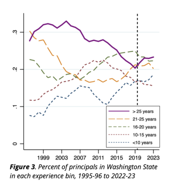 They found that over the past 26 years, principal turnover in Washington state remained generally consistent, at 20%, before spiking to 24.9% in 2023. However, a dig into disaggregated data revealed consistently greater principal turnover among novice and late career principals, so the experience profile of the principal workforce in a given year is associated with the amount of principal turnover that year.