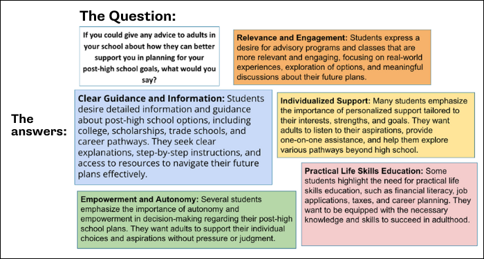 She said the surveys allow school teams to test their hunches about student aspirations, knowledge, and experiences in preparing for postsecondary. Each school is provided with a results dashboard that allows them to disaggregate the data by grade and key demographics.