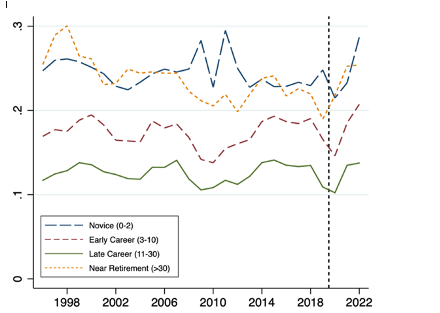 Annual teacher attrition in Washington State by experience level, 1995-96 to 2022-23.