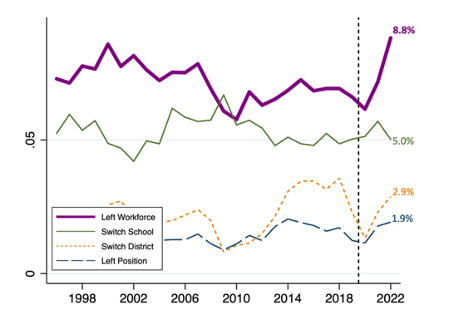 • The percentage of teachers leaving their school each year reached almost 20% during the COVID-19 era including about 9% who left the workforce altogether.