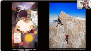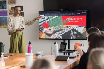 Because not all participants identify as visual artists and may not consider themselves to be creative, Michaela delivered a presentation that shared approaches to visual storytelling over time. As an art historian, she curated images from the 15th century to the 1960s to give us an understanding of how meaning is conveyed through art and design. Together we discussed how color, material, and textures work together to communicate a message—and how this medium of collage is open to anyone to play with.