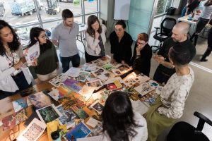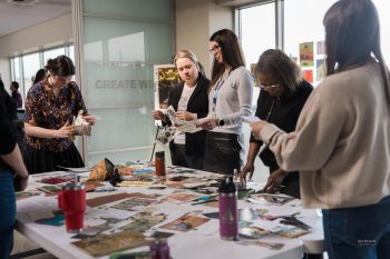Michaela distributed three packages of curated collage materials and guided us into the creative process. To begin, teams were invited to sort through the materials, with our assigned concepts in mind. The teams milled around, first sorting the images—sifting through cut-outs from children’s books, nature publications, and artwork from magazines.